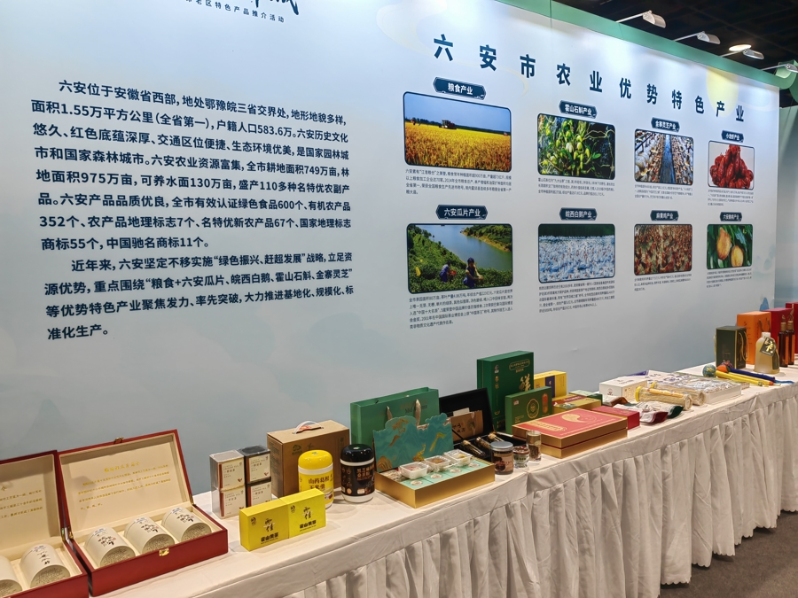 革命老区特色馆打造了“山海情·老区味”主题展区,从福建三明、安徽六安精心挑选的百余种地理标志产品在此亮相,永安笋干、淮土茶油、泰宁岩茶、六安瓜片、霍山石斛、皖西白鹅等特色产品琳琅满目,每一款都承载着老区的风土人情,凭借鲜明的特色和优良的品质赢得了不少市民的青睐。