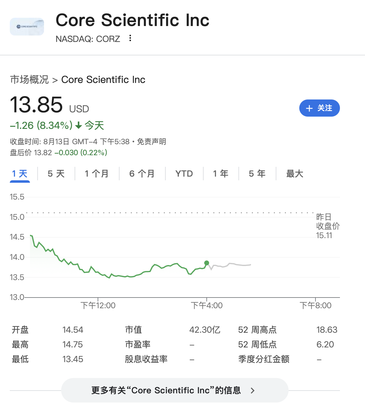 Core Scientific是CoreWeave近期收购的一家公司。周三,Core Scientific股价下跌8.34%。